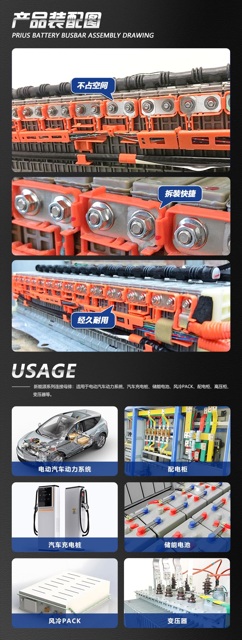 普銳斯豐田電池母排是混合動(dòng)力電動(dòng)汽車(chē)(HEV)和純電動(dòng)汽車(chē)(EV)中的關(guān)鍵組件,用于連接電池模塊并傳輸電流。作為平面或帶狀銅連接件,這些銅母排能高效地傳遞電流,保持電池模塊之間的電壓和電流平衡,防止過(guò)充或過(guò)放,從而延長(zhǎng)電池壽命。其優(yōu)異的導(dǎo)電性、機(jī)械強(qiáng)度和耐熱性對(duì)于確保車(chē)輛的最佳性能至關(guān)重要。